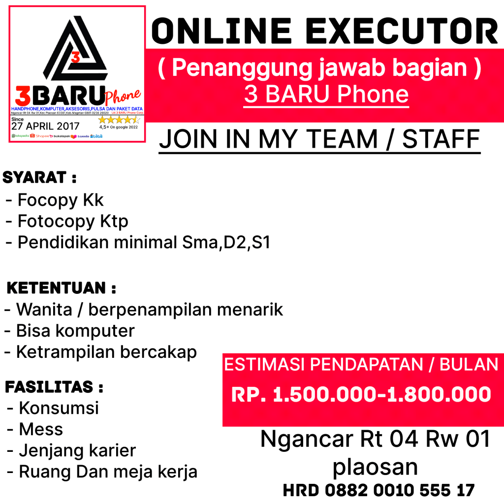 JENIS PEKERJAAN UTAMA NYA ADALAH,MEMASARKAN DAN MENJUALKAN DI TOKO 3 BARU Phone itu sendiri ( yang kami maksut ONLINE market place dan sosial media ).
